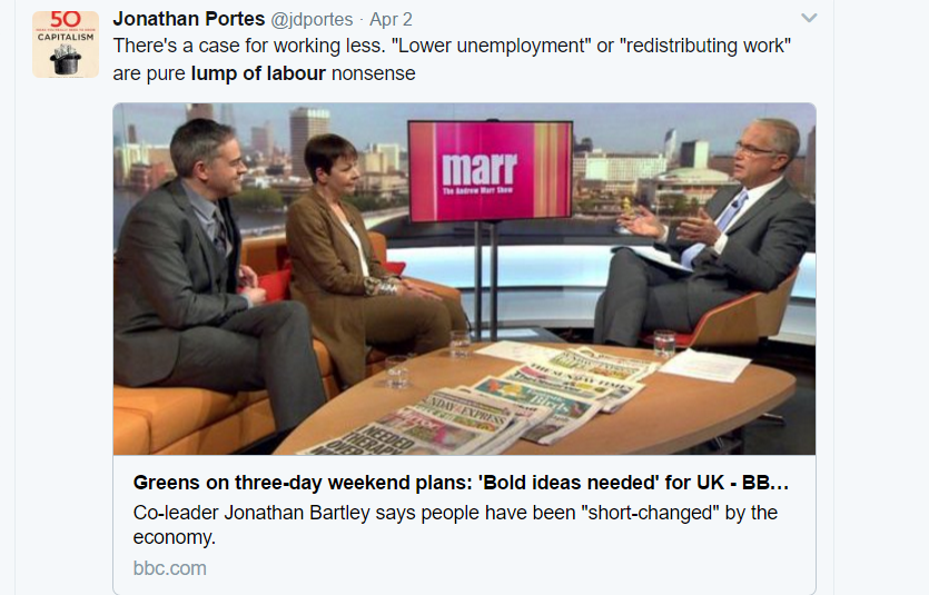 The Economist and Jonathan Portes are at it again. “Lump of labor! Lump of labor!” The occasion? A proposal for a four-day workweek announced by the U.K. Green Party at their convention this week in Liverpool.