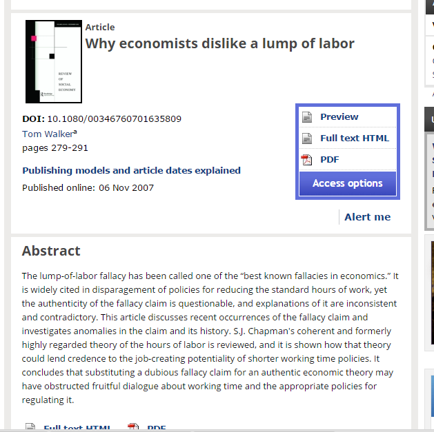 By Sandwichman Thank God it’s Boilerplate!: It’s Thursday and The Economist is lumping its labour The Economist and Jonathan Portes are at it again. “Lump of labor! Lump of labor!” The occasion? A proposal for a four-day workweek announced by the U.K. Green Party at their convention this week in Liverpool. The Economist pretended to find “two problems” with the Greens’ proposal: The Greens’ proposals encounter two problems. First, the theory. They argue that the reduced hours worked by some could be redistributed to others in order to lower underemployment. They thus fall prey to the “lump of labour fallacy”, the notion that there is a fixed amount of work to be done which can be shared out in different ways to create fewer or more jobs. In fact, if people worked fewer hours, demand would drop, and so fewer working hours would be on offer. Second, the cost. Increased productivity could cover some of the costs of paying a five-day wage for a four-day week, suggests Sarah Lyall of the New Economics Foundation, a think-tank. She points to a Glasgow marketing company that did just that, and experienced a 30% leap in productivity. But that is an astonishing increase to expect across the board. First the theory: why does the idea of redistributing work require a “fixed amount of work to be done”? I can cut up a pie in many different ways.