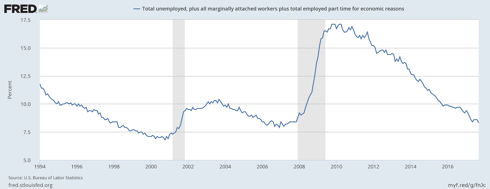 This chart (better known as the U-6 unemployment rate) presents the information in a percentage format. This statistic was 10% at the beginning of 2016, which was the highest level of the previous recession. But during this expansion, we hit this level a full seven years after the recession ended. That’s quite a delay.