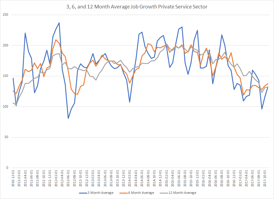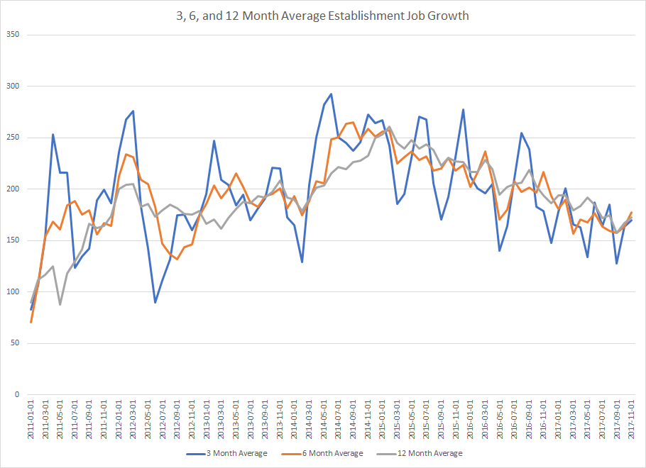 The 3, 6, and 12-month moving average of establishment job growth are all about 170. However, notice that all three area moving sideways for the most of this year. This tells us the economy will probably continue to print at this level (on average, of course) for the next few months