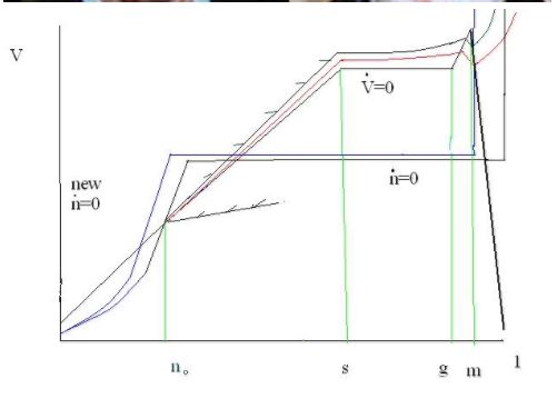 OK all this depends on the figure which I will feebly try to explain. The red curve is the lowest curve whith increasing V for initial n n_0. The very key Vdot = 0 curve is hard to see. It slopes up from 0 to s as more people in the city help each produce (s for Solow or standard or something because after that, for a while nothing weird happens). At g the “wage” jumps up. This is like the late 90s in the US somehow with a growth spurt. G is for Greenspan or Glassman or Gilder or anyway someone who thought the tech bubble would last. At meverything begins to go wrong and society starts to collapse in the city. This is named Malthus or Marx or anyway someone gloomy. So the Vdot =0 curve slopes up, goes flat, slopes up steeply then slopes down very steeply. If congestion problem went critical very suddenly, the V dot curve could jump down and wouldn’t be continuous. In this case the saddle path to the saddle steady state (low n steady state) could be the only equilibrium.