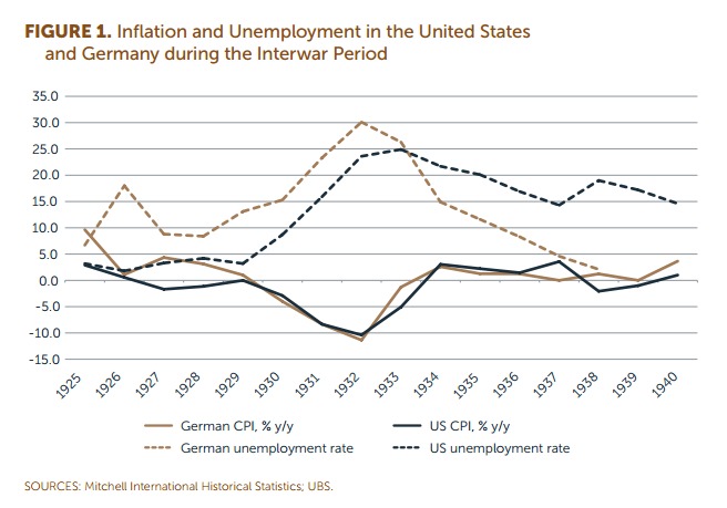 The Group of 30 central bankers and economists has produced a new report, "Fundamentals of central banking: lessons from the crisis". It traces the history of central banking theory and practice, including the economic thought that underlies it. And it draws from it some important lessons about the causes of the 2008 crisis and the reasons for the very long, slow recovery. I've discussed the main themes of the report here (Forbes).But in this post, I want to focus on a particular piece of economic history. This chart leapt out at me from the report: Note that this chart starts only two years after the Weimar hyperinflation, hence Germany's elevated inflation rate at the start. This is important, as we shall see.What struck me is how similar the profiles of the two countries are during the Depression. Both experienced Fisherian debt deflation - annualised CPI fall at peak was 10% for both countries. And both had very high levels of unemployment. German unemployment was actually higher than American, peaking at 30%.But the recovery was very different. German unemployment fell rapidly during Hitler's tenure, while US unemployment remained elevated until after World War II. Looking at this chart, an alien from Mars who knew nothing of the history of the 20th century might think that the German government did a far better job of restoring its economy than the American government.