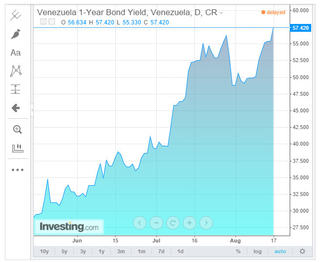 Via Business Insider comes this colourful map and chart of CDS spreads worldwide: Those who thought Greek bonds would be the most expensive to insure, since everyone knows it can't pay its debts, need to think again. Venezuela is the most expensive, by a long way. Related to that is this: The yield curve has been deeply inverted all year, but yields at all maturities are now rising: When even the yield on long-dated bonds is heading for 30%, the public finances are completely unsustainable. Venezuela, of course, is monetarily sovereign, since it issues its own currency. Well, in theory. In practice it is burning through reserves at a shocking rate to support its absurd managed exchange rate system: Don't be fooled by the uptick in June. That is because China lent it some dollars. It'll get through those in short order if it continues on its present path. To be sure, Venezuela is still earning FX due to its trade surplus, but its current account is deteriorating. Floating the currency is not really an option. The black market exchange rate is approaching 700 VEF to 1 USD. Inflation in Venezuela is officially nearly 70%, but almost certainly much more, since the central bank has provided no updates since December: some estimates put it over 100%. Whatever it is, it is undoubtedly rising fast despite the pegged exchange rate. The bolivar is currently pegged at 6.
