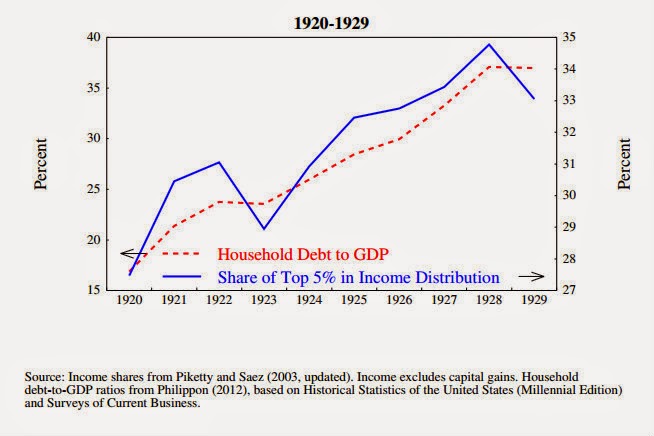 UPDATE: It seems I haven't been keeping up. In their paper "Inequality, Leverage and Endogenous Default", IMF researchers Kumhof, Ranciere & Winant consider exactly the same issue in relation to the US. This chart says it all, really: