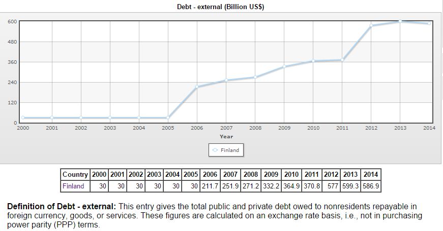 UPDATE. Ramanan points out that the chart above is gross external debt. Current net figures are hard to find (completely missing from Eurostat, and Bank of Finland only reports gross figures). Standard & Poors helpfully provides this table from March 2015 showing their gross and net external debt calculations: