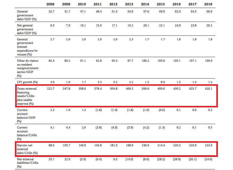 I am personally of the opinion that such a large increase in external debt (net and gross) is by itself sufficient justification for downgrade. High external debt seriously raises the likelihood of foreign exchange crisis and external default, particularly for members of fixed exchange rate systems.