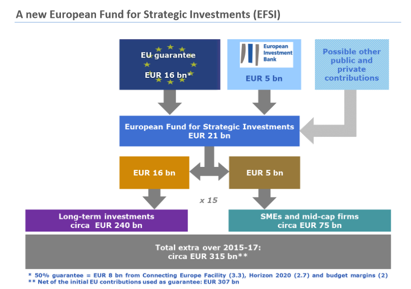 I've highlighted what is an extraordinary statement in this paragraph, given what we already know about the capital sources for the EFSI. Here is the diagram from the original EFSI proposal document. Look at the footnote:In the first months of 2016, the regional groups established to oversee the implementation of the Projects of Common Interest (PCIs) will discuss eligible projects that the EFSI could help finance. The EU budget for 2014-2020 already increased the energy sector allocation and the EFSI should complement it to give EU consumers access to secure, sustainable and competitive energy. The EFSI can be combined with other sources of funding in the EU budget for particular projects and platforms, in particular Connecting Europe Facility (CEF) financing (both grants and financial instruments) and European Structural and Investment Funds (ESIF). The effectiveness of the EFSI could benefit from the combination of financial instruments, EIB loans and grants in a "blending approach".