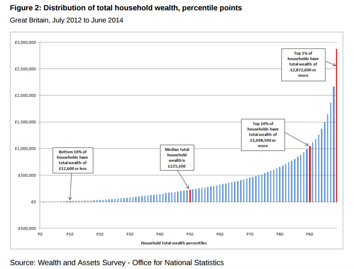 This is the UK's wealth distribution in 2012-14, from the fourth and final "wave" of the Wealth and Assets Survey (WAS). The divisions are deciles: the Bank of England has used quintiles, but these are easy to derive from this chart.