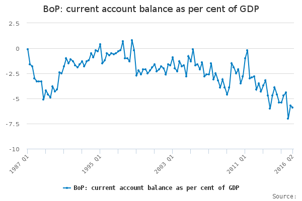 Some people have been saying that sterling's fall has nothing to do with the Brexit vote. Sterling was already falling before the vote, they say, because of the UK's wide and growing current account deficit. So I thought I would fact check this.Here is the UK's current account deficit since 1987, courtesy of ONS: Well, ok, it has rarely been anywhere near balance in the current century, and it has been trending downwards since 2011.Now let's look at sterling. Here is sterling's trade-weighted exchange rate since 1992, courtesy of the Bank of England (via this House of Commons briefing paper): Umm. The correlation between the current account deficit and the trade-weighted value of sterling appears to be negative. Sterling has been rising since 2011 - until this year.This is actually reasonable. The trade-weighted value of a currency reflects the external performance of the economy. And for a long time now, current account deficits have not been regarded as important for countries with floating exchange rates and independent central banks. So sterling has risen because the UK has been doing well compared to other countries - notably the depressed EU.Breaking down the current account into its component parts shows why the current account and the value of sterling have been negatively correlated.