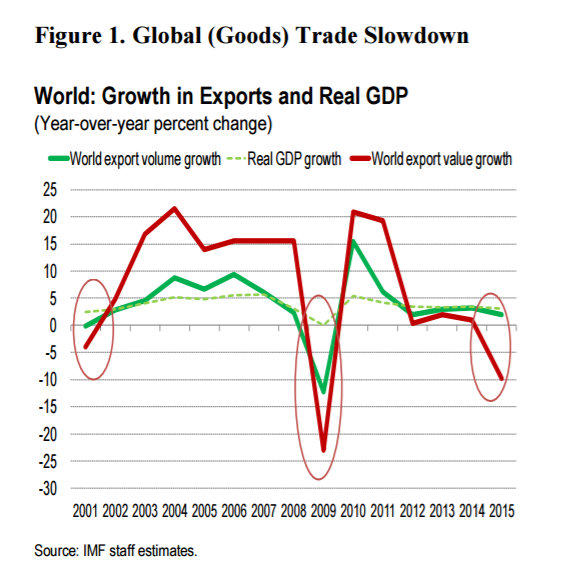 But we don't have a developed-world recession now, do we? The developed world is struggling to get inflation off the floor, of course: interest rates are extremely low - in some places negative - and three major central banks are doing QE. In Europe, growth remains elusive and unemployment very high. The US is doing better, but has backed away from planned interest rate increases. Japan is now in its third decade of stagnation. And the UK, which was looking pretty good, has shot itself in the foot. In July, the IMF cut its global growth forecast by 0.1% because of the impact of the UK's decision to leave the European Union. Their October forecast is due out shortly, and signalling ahead of the release is that like everyone else, they are worried about the slowdown in global trade.