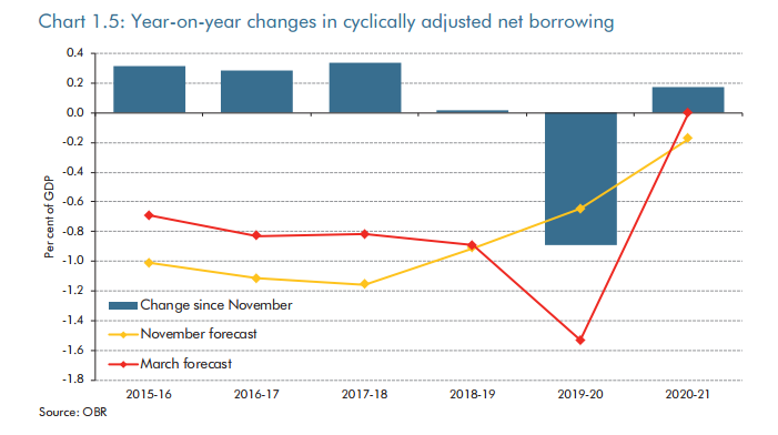 The OBR's forecasts show that the fiscal finances are considerably weaker than they were even last November. The planned surplus is highly sensitive even to small changes in economic conditions. Far from the Board being able to afford a generous dividend, it should be retaining earnings to build up buffers. From this perspective, the Chancellor's largesse appears foolhardy.The surplus in 2019-20 could fall to zero due to relatively small differences in the output gap (if it were -0.7 per cent in that year, not zero), potential output (if it were 1.0 per cent lower), whole economy prices (1.2 per cent lower), debt interest spending (due to interest rates 1.2 percentage points higher than market expectations or a 2.2 percentage point upside surprise in RPI inflation), effective tax rates (a 0.5 percentage point lower tax-to-GDP ratio, due to the composition of GDP, distribution of incomes or movements in asset prices), or the delivery of public spending cuts (a quarter less than planned)...