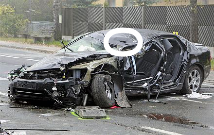 Conceivable would be an explosion, triggered for example by a mounted on the roof or an explosive fired by a drone missile that at the moment in which it has taken its goal this seriously injured and himself largely destroyed. This process would have taken place just before the car is out of control. The car would be in the event that this scenario is true, become a 'non-steerable floor' - not, however, because the driver had tried in vain to bring the car back under control, but because - as stated in an article [14] Jörg Haider at this time already turned and was therefore unable to somehow act on his car. The hole in the roof of the car speak for these assumptions, the lack of skid marks, just above the driver's seat, the severity of injuries and the pressed-out, flung onto the roadway the driver's side doors.