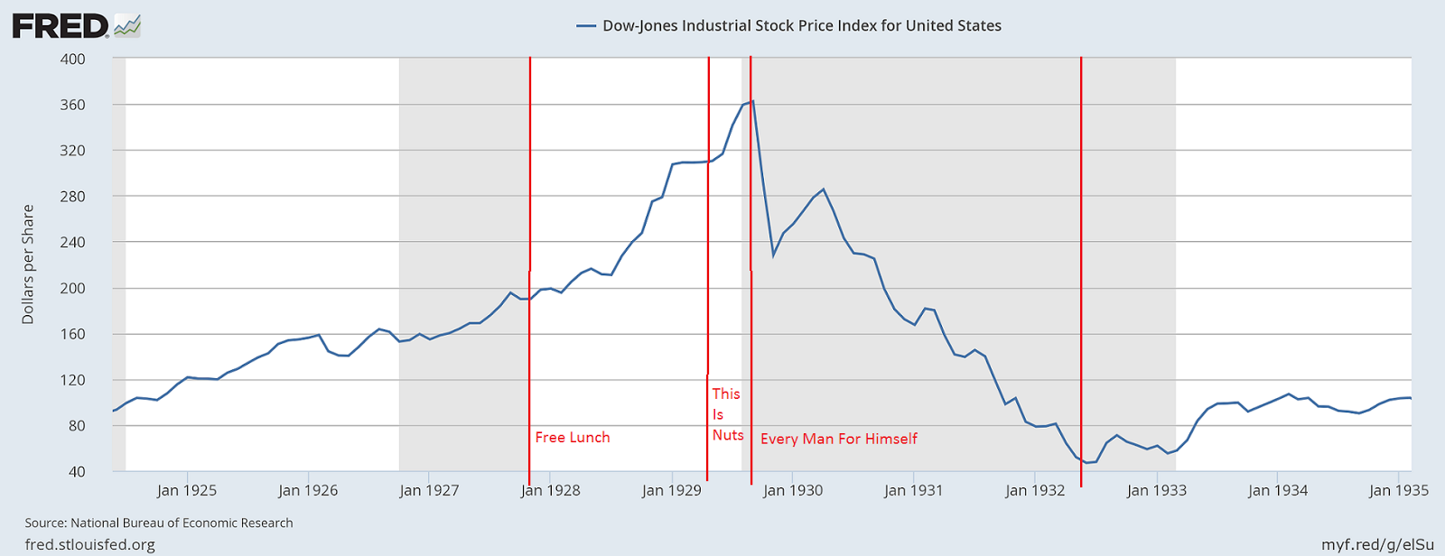 - The "Every man for himself" period (sorry, FT, I couldn't find a reference for this one). Prices crash as everyone runs for the exit. This can happen a number of times, separated by brief periods of stability when everyone congratulates themselves on a lucky escape. But they are wrong. The ship is sinking.