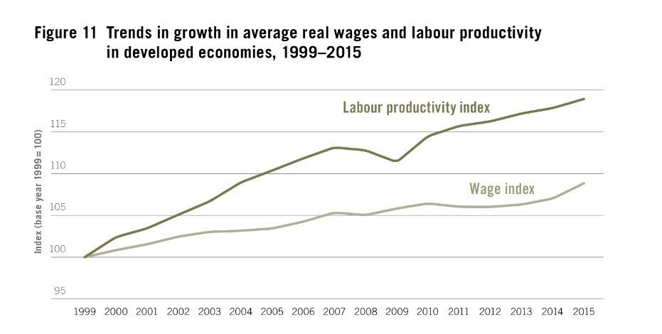 - technology: the "skilled middle" are losing out as their jobs are automated. As Ryan Avent explains, robots who can do skilled routine work faster, cheaper and better displace humans, who are forced into low-skill, low-wage, low-productivity jobs such as care work and hospitality. This creates a productivity boom for robots, coupled with declining wages for humans. Hence the productivity-wage divergence.