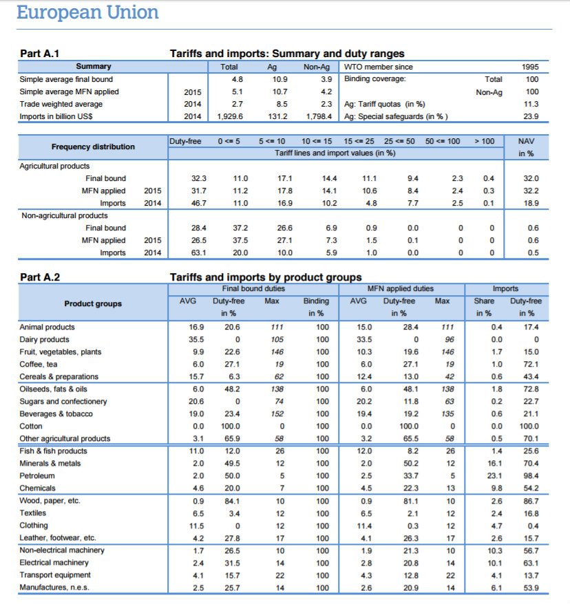 The potential impact on the UK's trade with the EU from introducing new tariffs is considerable. I've reproduced here the WTO's table showing the current EU MFN tariffs: