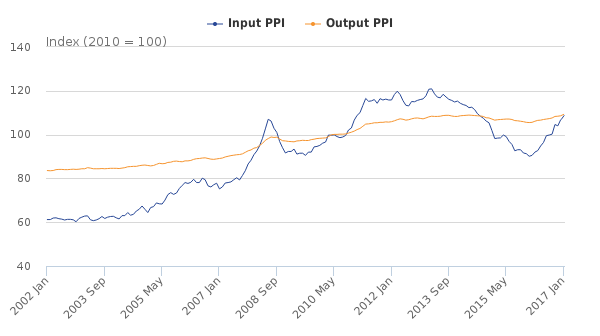 But consumer price inflation - the prices that people pay for goods in the shops - is only one side of the equation. On the other side is producer price inflation (PPI), the prices that companies pay for the materials and energy they need to produce goods and services. The picture here is entirely different, as this table from ONS's January 2017 producer price inflation report shows: