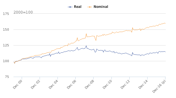 (source: ONS Gross Domestic Product time series January 2017)UK output fell off a cliff in 2007, then tried to recover in 2009-10 but was clobbered by rising oil and commodity prices. I have previously observed that the UK in 2010-12 suffered double-digit inflation in energy prices, which in my view was the principal reason why the UK economy flatlined. If the QE-driven oil and commodity price bubble was the principal cause of the failure of the UK's recovery, then the prolonged use of QE by the US to restore its own economy has had terrible consequences for the UK. QE spillovers are known to be inflationary for emerging markets, but it seems that there was also an indirect inflationary effect in oil-dependent developed countries, which showed itself as stagnant output, poor productivity and flat wage growth.