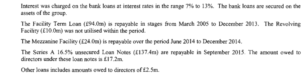 And these are the types of debt, with the interest rates charged: Of course, some of the bank loans were existing Maplin borrowings brought through to the new holding company on consolidation. But by far the largest proportion of this debt is new. It seems that Montagu Capital financed the acquisition with a mix of bank loans and unsecured debt. But there's something distinctly odd about the Series A loan notes. The interest rate was significantly higher than it should have been for senior unsecured debt, even in 2004. It was higher than the interest rate charged by Rutland on its deeply subordinated shareholders' loans. And not only was the interest rate high, some of the interest was capitalised, thus compounding the interest. That suggests it was mezzanine debt. So, were the Series A loan notes subordinated? If so, why? Maplin was a healthy, fast-growing company which had delivered a stellar rate of return to its previous owner. There was absolutely no need for such an expensive form of financing. I'd call that extortion, personally.