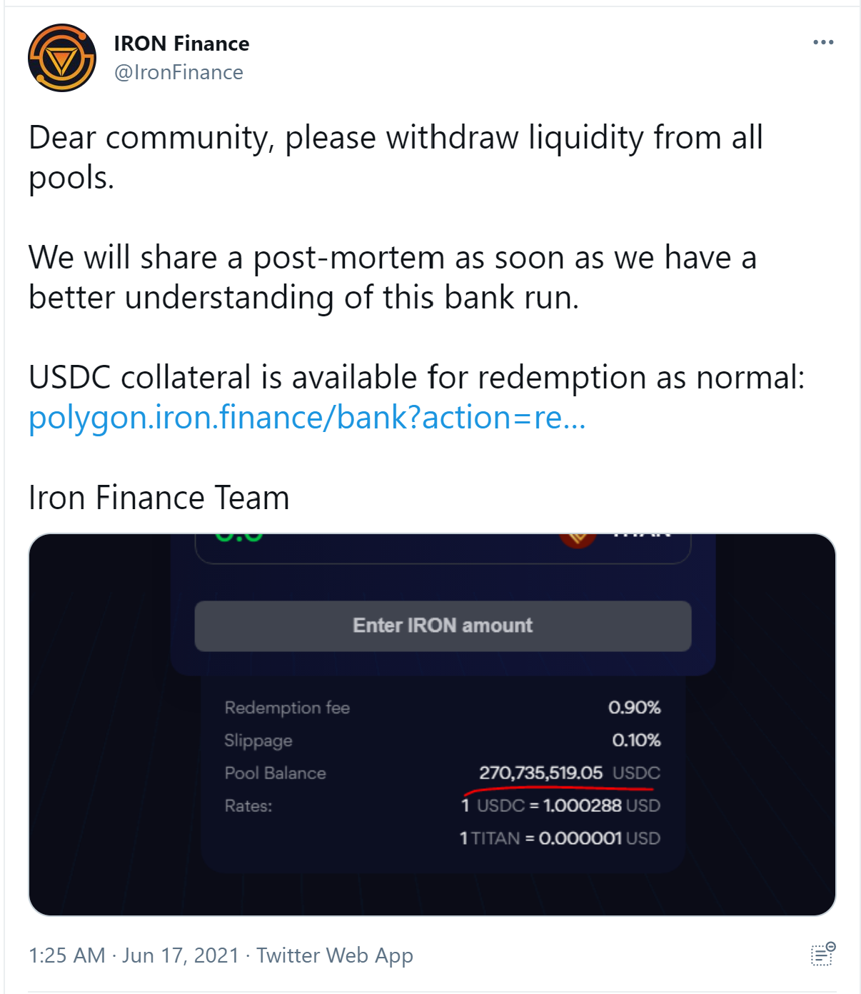 In my view, this was the real aim of the whales who started this "run". Crashing the price of TITAN was merely a means to an end. So TITAN's collapse was not a panicky bank run, as Iron Finance thinks. It was a deliberate attack on a USD-pegged token to force the peg to break.
