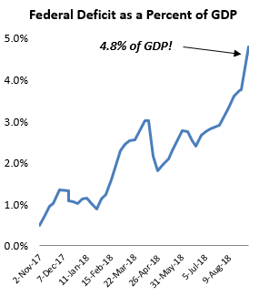 A giant end-of-month spending spree in August has ballooned the Federal defiicit to 0 bln and 4.8% of GDP.This is the largest nominal deficit since 2009 and the largest as a percentage of GDP since 2012.The MMT gods should be cheering this. They're not. Weird.