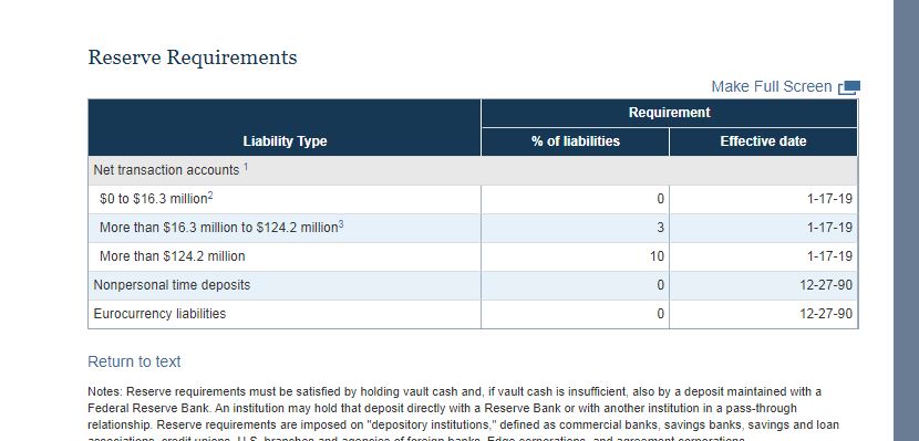 Fed issued regulatory update January 2019 here: Approximately 10% of Deposits, I never figured it would be that high... somewhat shocking...Deposits September 4 were ,963B (Mike's report has been documenting a recent rapid increase in Deposits as bank lending growth has been pretty solid) and Reserves at Depositories were last seen rapidly dropping towards ,300B on the poorly executed post "Debt Ceiling!" fiscal adjustments so you do the math and see why FF market became dysfunctional and they had to temporarily add B and now are poised to add to that this week...Which will as usual temporarily depress the Leverage Ratio at the Depositories and as usual cause another temporary decrease in observed prices of risk assets...They are going to have to soon increase Reserves