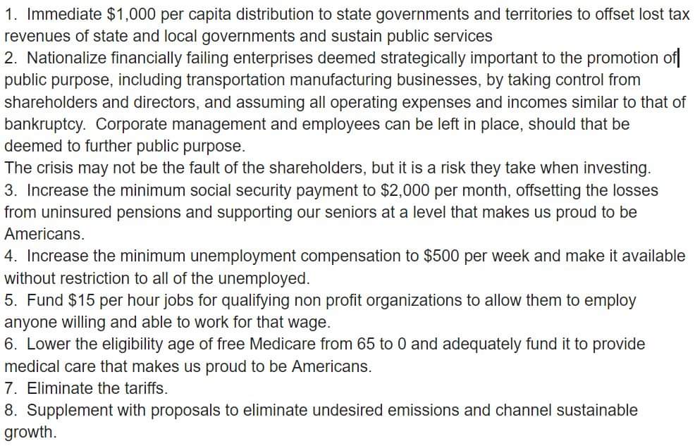 The Coronavirus Crisis has caused economic havoc. In this article, Warren Mosler and Dirk Ehnts discuss policy proposals that are informed by Modern Monetary Theory (MMT). Brave New EuropeDirk Ehnts, Warren Mosler – A Euro Zone Proposal for Fighting the Economic Consequences of the Coronavirus CrisisWarren's draft proposal for the US from his Twitter feed: