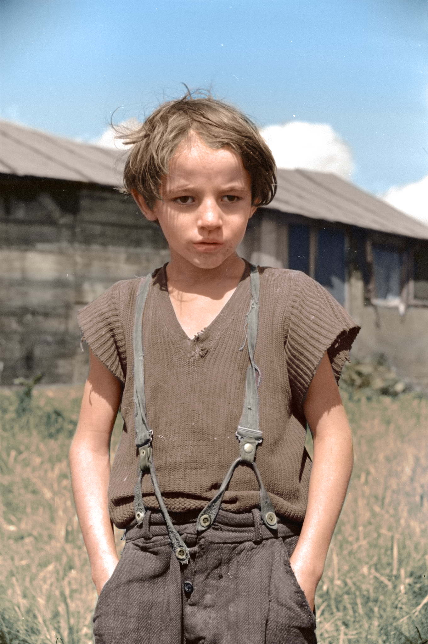Son of a woodcutter, Eden Mills, Vermont, colourised, 1936