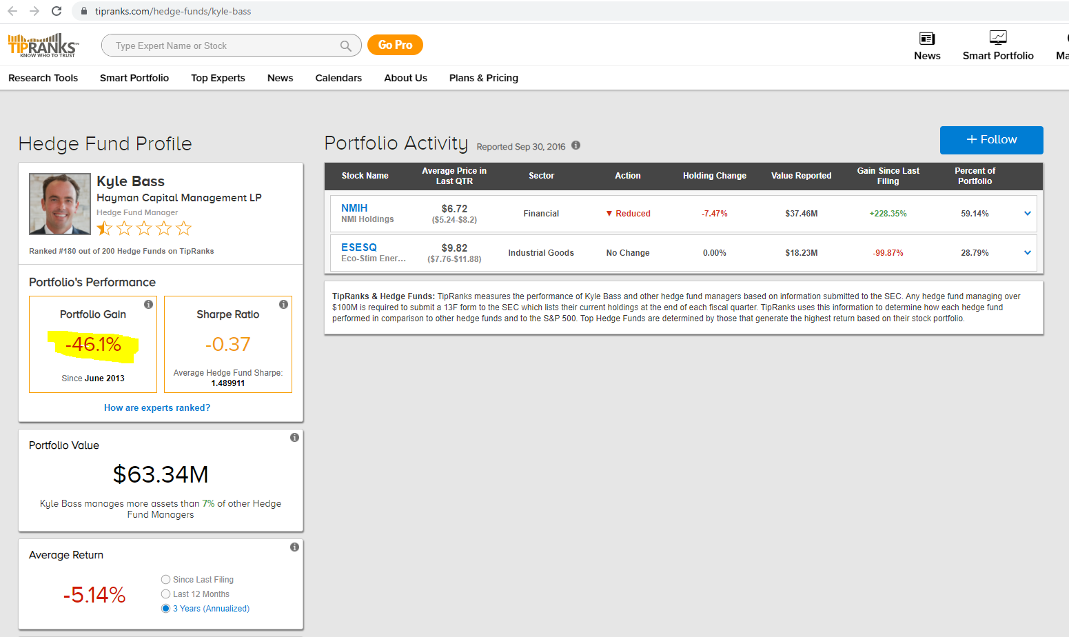 I've spoken about this idiot many times in the past. (And commented on his idiotic calls.)This is what happens when you fundamentally don't understand how the monetary system works.The guy's fund is down 46% since 2013. Not surprising.What surprises me is who gives this guy money to manage? BTW...the S&P is up 270% in the same period of time. And the average hedge fund way underperformed the market, not as bad as Bass, but well below the market's return.They all suck.Schiff probably the same.