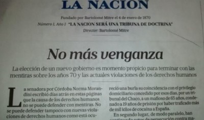 La Nación, the main conservative daily, that benefited economically from the last dictatorship and supported it, had an editorial demanding an end to 'revenge.' They called the left of center militants the true terrorists of the 1970s, even though the vast majority had committed no violent crime (and even those that did commit crimes should have been prosecuted according to the law, not tortured, and summarily executed). Macri has suggested that he will not stop the judiciary system from prosecuting human rights violators. But he made it clear that this will not be part of government policy.