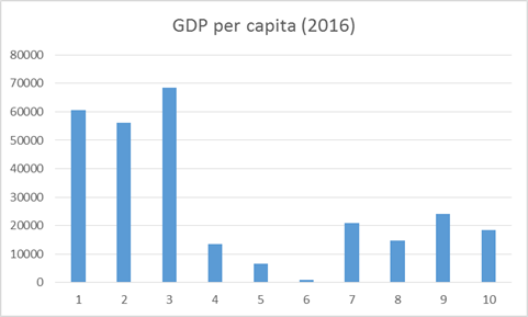 Teaching Latin American Economic Development. Asked students to match the list of countries below with the graph representing GDP per capita in 2016 (source here). List of countries: Argentina, Brazil, Chile, China, Congo, India, Mexico, Norway, Saudi Arabia, and the US. The point I always try to make is that Latin American economies are (most of them) middle income countries, all the ones in the sample with higher GDP per capita than China. That's often a surprise for many students, which think that China is an advanced economy (yep, grows fast, less now, but it's still a middle income economy, and will probably remain so in the foreseeable future). Also, Saudi Arabia has a very high level of GDP per capita, but it's not really a developed economy. An advanced economy produces more than commodities (oil in this case). So what the economy produces and exports matters.PS: Solution in the comments section.
