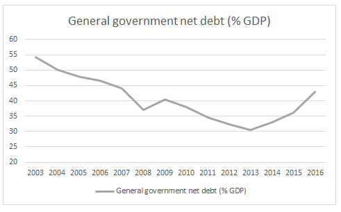 It is only with the crisis itself that the fiscal accounts worsened, and that went hand in hand with austerity policies. Actually more primary spending, and less financial spending, would have accelerated growth and revenue without creating any fiscal problem. And yes net debt went up, but remains below the initial level (see below). And more importantly the debt is in domestic currency. Foreign debt and the current account are not really problems, since Brazil has a pile of international reserves and has access to international capital markets that maintain (and will continue to do so) low interest rates.