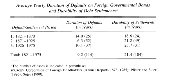 PS: Table 1 in Borensztein and Panizza also show the average periods of defaults, and they tend to be longer in the early periods too.