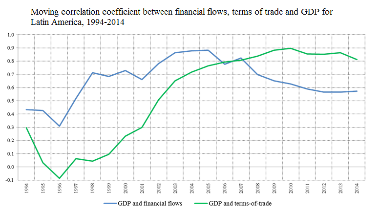 From the presentation with Esteban Pérez. The graph shows that growth in the region is increasingly tied to terms of trade changes and financial flows. This was something we discussed a few years ago here.
