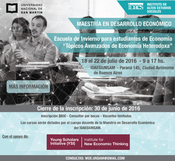 Announcement for those interested in a Summer (Winter down there) school in Spanish. Topics (in Spanish) Ariel Dvoskin: Teoría de la distribución y controversias del capitalJuan Matías de Lucchi: Del monetarismo fugaz a un sistema de metas de inflaciónNicolás Grinberg: América Latina y Asia del Este: Desarrollo económico comparadoGermán Feldman: Tipo de cambio real y restricción externaPablo Lavarello: Empresas Multinacionales en la actual fase de internacionalización:implicancias para los sistemas nacionales de innovaciónNatalia Reynoso: Los aportes de Michal Kalecki a la teoría del desarrollo económicoVerónica Robert: Enfoque evolucionista del cambio tecnológico y eldesarrollo económico. Debates sobre política industrial y tecnológicaCorina Rodríguez Enríquez: Economía y Género. Implicancias para la agenda de desarrollolatinoamericanoFernando Toledo: Estabilización, políticas de ingreso y conflicto distributivo en economíasabiertasMatías Vernengo: Revisión crítica del Nuevo Consenso Macroeconómico.