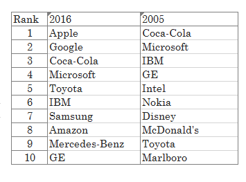 I'm not sure the value of global brands should be taken too seriously, as compared to other more tangible assets. At any rate, for what is worth, below is the change in the list of Interbrand's Top 10 most valued brands between 2005 and 2016. Two auto companies left (unless you count Google). Nokia is gone, and Apple and Samsung (for now) are there. Also, no Marlboro, which is not a surprise, or McDonald's. In 2005, Apple was 41, Google 28, and Amazon 68 in 2005. And Amazon is the fastest growing (in the Top 10 list, overall is Facebook). Share Get link Twitter Google+