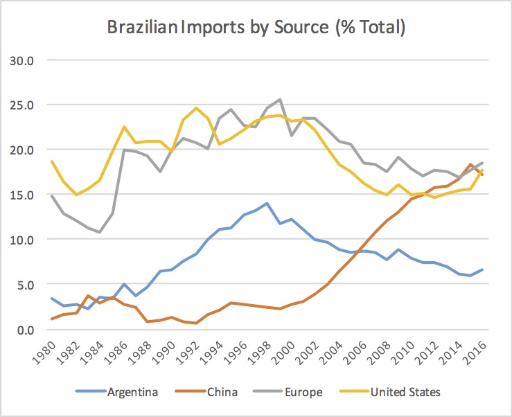 After the Chinese entry in the WTO in 2001 the rise in Brazilian imports is astounding. Now Chinese imports of manufacturing goods are about the same share as imports from the US and the European Union.