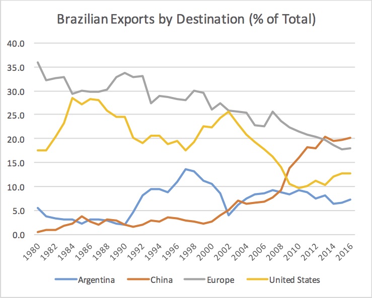 Brazilian exports to China, on the other hand, only take off after the Global Crisis in 2008, even though an increase after 2001 is also visible. This suggests that, in spite of the slowdown in China, their relatively rapid growth has sustained the external markets for Brazilian commodities (iron ore and soybeans mostly). There is a lot to be said about the patterns of specialization that this South-South integration has shaped, and the problems that it entails for Brazil and other Latin American economies, of course. But that's for another post.