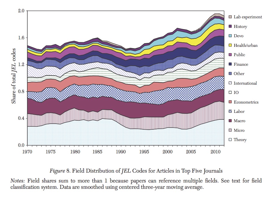 The authors suggest that "the relative shares of the different fields are fairly constant over time: theory is the largest field, accounting for about 30 percent of all articles; macro is next (about 20 percent of papers); labor and microeconomics are tied for third (16–17 percent each); and econometrics, IO, and international each account for about 10–12 percent of papers)." However, you can notice (or so it seems visually) that the Lab Experiment field now appears clearly, and that Development, Health, Finance and IO have grown over time. I would prefer to have the graph with the shares of fields.