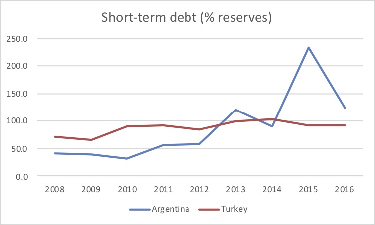The fact that this is a global phenomenon (the depreciation of currencies of developing countries) suggests that the hike of the interest rate in the US plays a role. It seems also that the financial deregulation and the financial position of some developing countries explain why they are having more trouble than others (e.g. Brazil, which is in the middle of a serious economic and political crisis, but sitting on top of US$ 380 billion in reserves). I haven't found more recent data (this from the World Bank goes only to 2016), but the graph below shows the short-term debt to international reserves ratio; the reverse of the Guidotti-Greenspan rule).