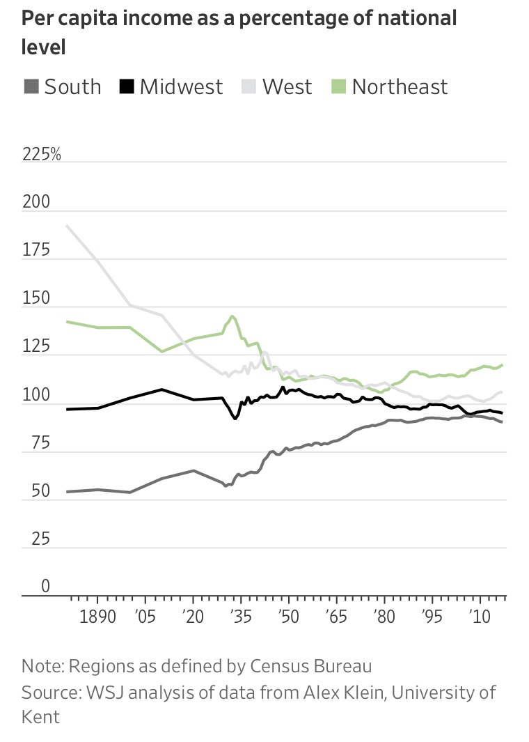 The catching up story is one associated mostly to State action, since the New Deal in many ways was a sort of Marshall Plan for the South (think TVA), even though the WSJ piece emphasizes policies, like lower taxes, and the lack of unions. And there is a lot to discuss there.