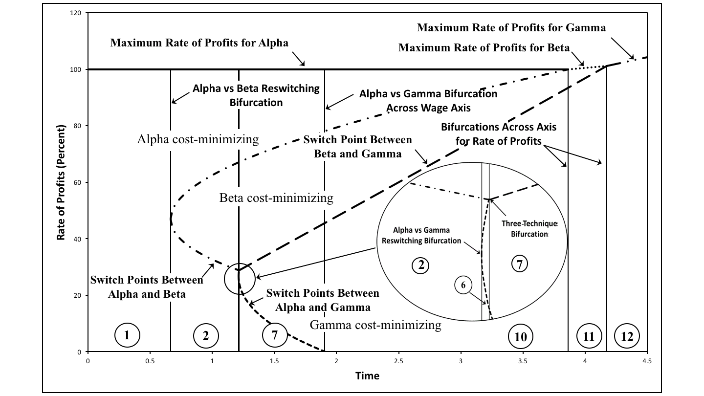 Variation of Switch Points with Technical Progress in Two Industries I have a new working paper - basically an update of one I have previously described. Abstract: This article illustrates the application of bifurcation analysis to structural economic dynamics with a choice of technique. A numerical example of the Samuelson-Garegnani model is presented in which technical progress is introduced. Examples of temporal paths through the parameter space illustrate variations of the wage frontier. A single technique is initially uniquely cost-minimizing for all feasible rates of profits. Eventually, the technique for which coefficients of production decrease at the fastest rate is always cost-minimizing. This example illustrates possible variations in the existence of Sraffa effects, which