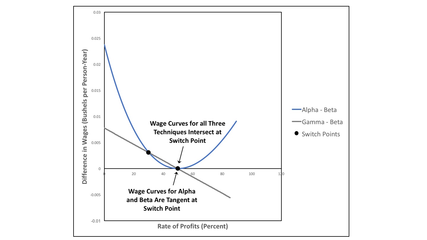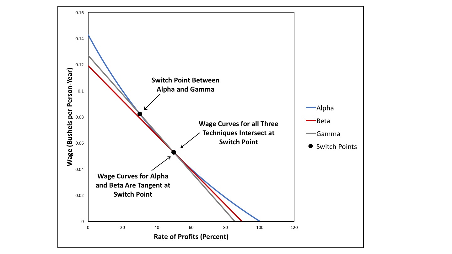 The choice of technique is analyzed based on prices of production and cost-minimization. Labor is assumed to be advanced, and wages are paid out of the surplus product at the end of the year. Corn is taken as the numeraire. Figure 1 graphs the wage-rate of profits for the three techniques. The cost-minimizing technique, at a given rate of profits, maximizes the wage. That is, the cost-minimizing techniques form the outer envelope, also known as, the wage frontier, from the wage curves. Aside from switch points, the Alpha technique is cost-minimizing at low and high rates of profits, with the Gamma technique cost-minimizing between the switch points. At switch points, any linear combination of the techniques with wage curves going through that switch point are cost-minimizing.