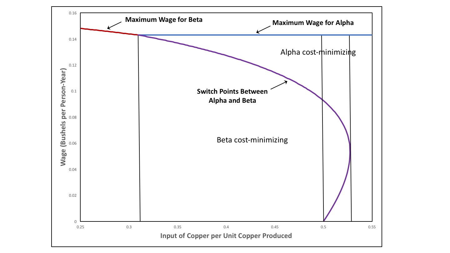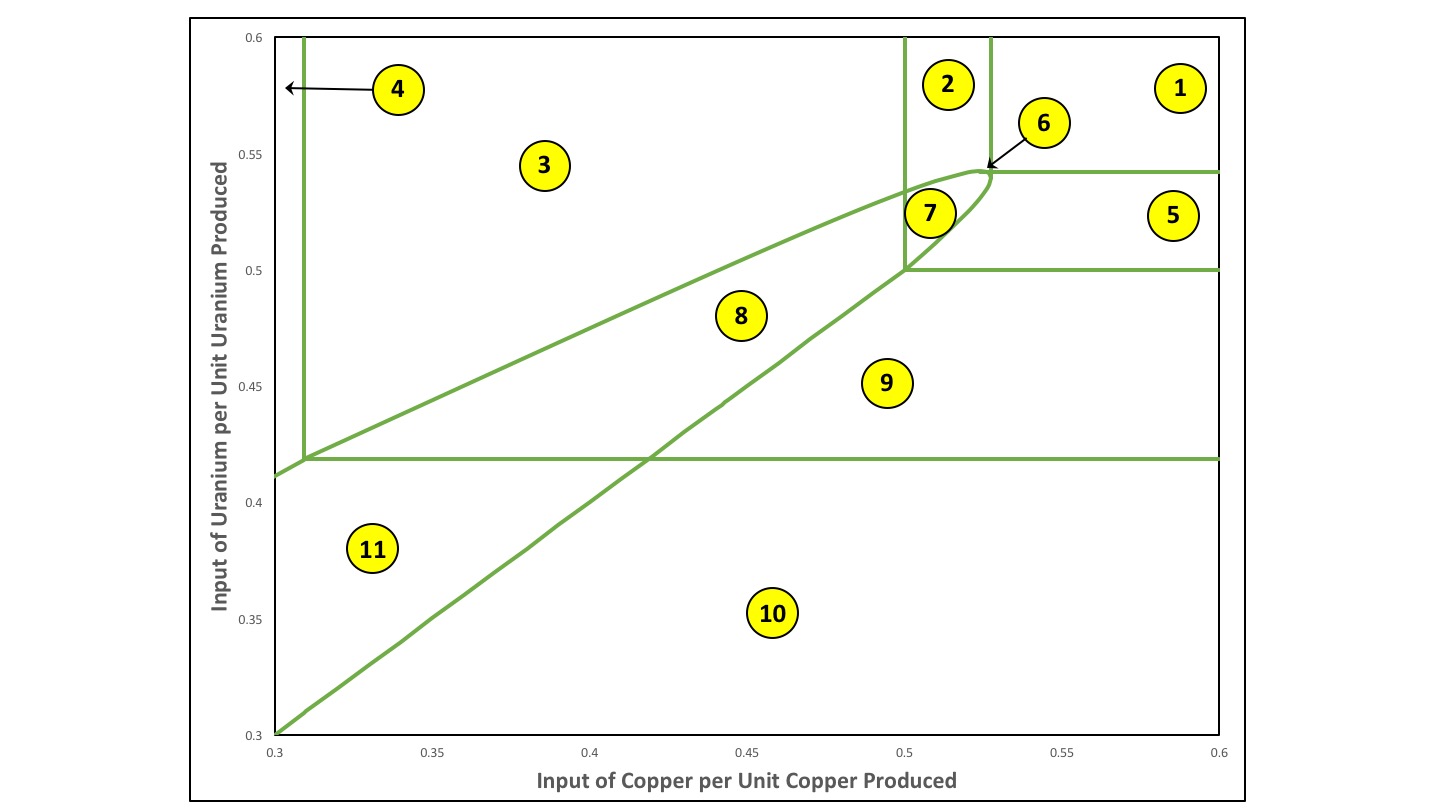 Consider the variation in the number and location of switch points as the coefficient of production for the input of copper per unit copper produced, a11, β, falls from over 48/91 to around 1/4. In this analysis, the coefficient of production for the input of uranium per unit uranium produced, a11, γ, is set to 3/5. This variation in a11, β, while all other coefficients of production are fixed, describes a type of technical progress in the copper industry.