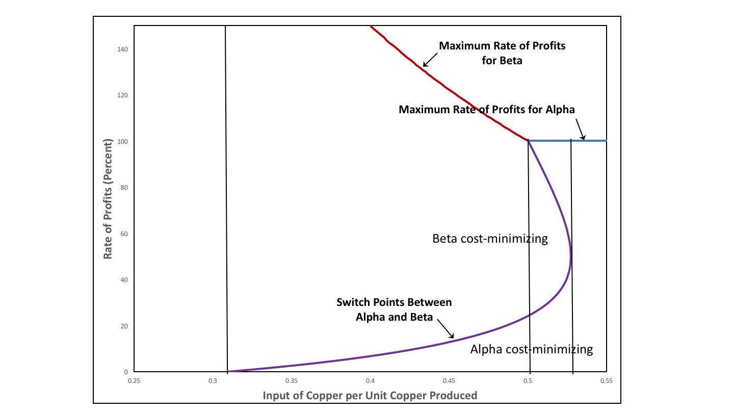 Figure 3 shows the configuration of wage curves when a11, β has fallen to one half. The interval with high rates of profits where the Alpha technique is uniquely cost-minimizing has vanished. The switch point between Alpha and Beta at high rates of profits occurs at a wage of zero. I call Figure 3 an example of a bifurcation around the axis for the rate of profits. For a slightly smaller value of a11, β, the switch point on the axis would vanish, and only one switch point would exist, in this example, for a non-negative wage.