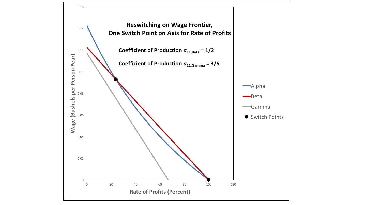 Figure 2 shows the configuration of wage curves near the start of this story. The Gamma technique is never cost-minimizing. For all feasible rates of profits, the wage curve for the Gamma technique falls within the wage frontier. For a parameter value of a11, β of 48/91, the Alpha technique is always cost-minimizing. A single switch point exists, at which the wage curve for the Beta technique is tangent to the wage curve for the Alpha technique, and the Beta technique is also cost-minimizing. I call a configuration of wage curves like that in Figure 2 a reswitching bifurcation. For a slightly lower value of a11, β, two switch points would emerge. The Alpha technique would be cost-minimizing for low and high rates of profits, with the Beta technique cost-minimizing at intermediate rates of profits.