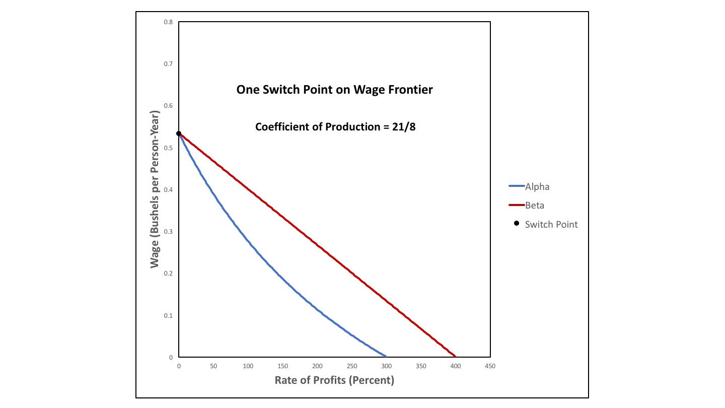 3.0 A Result of Technical ProgressFor a high value of the parameter e, the Beta technique minimizes costs, for all feasible wages and rates of profits. Figure 2 illustrates wage curves when e is equal to 21/8. For any wage below the maximum, the Beta technique is cost minimizing. But at a rate of profits of zero, a switch point arises. Both techniques are cost-minimizing.