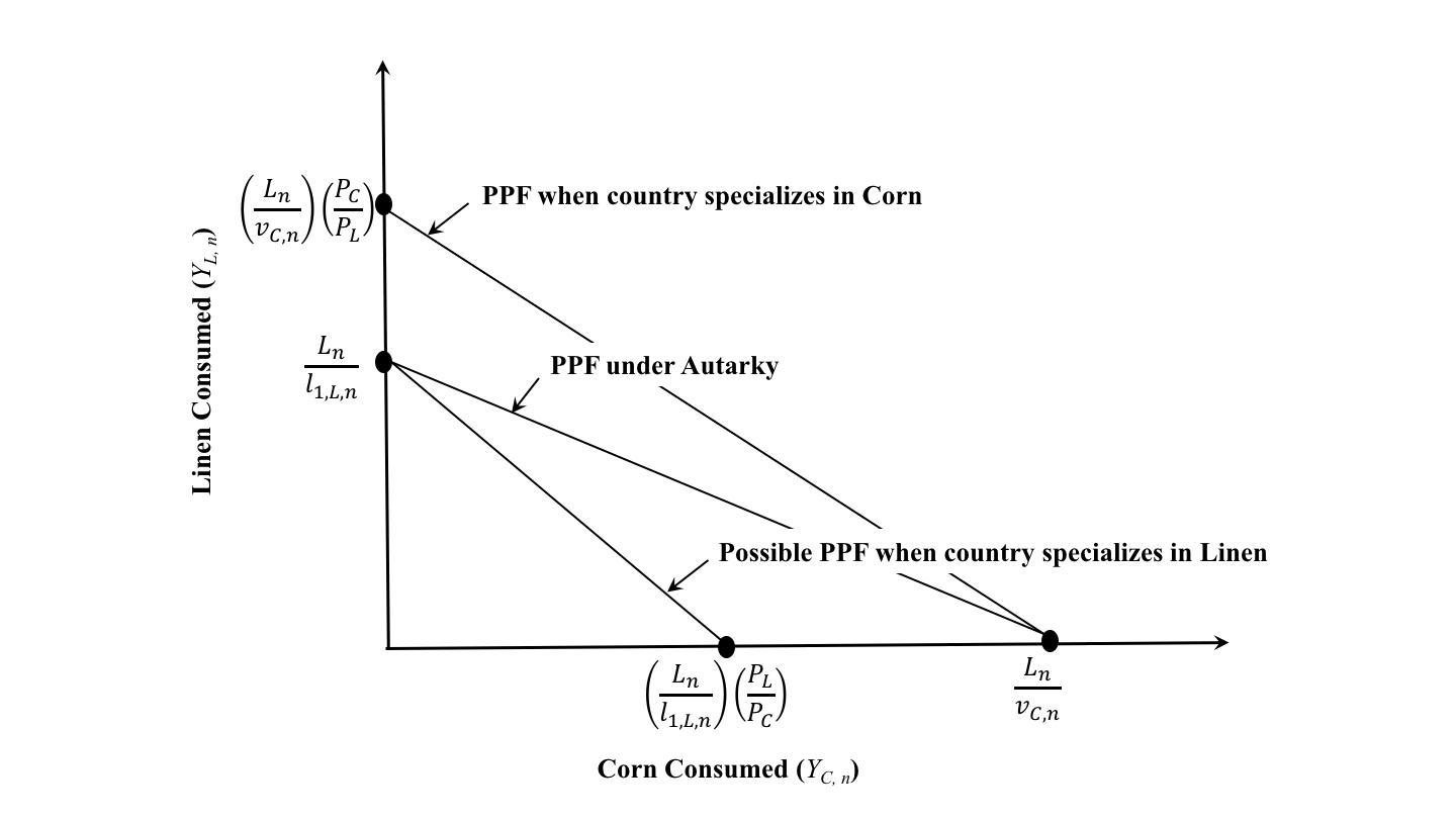 Figure 2 graphs these PPFs. The possibility of foreign trade rotates the autarkic PPF, with the pivot on an axis, depending on which product the country specializes in. I have drawn the PPFs such that when the country specializes in the production of linen, it is worse off as a whole. If any corn is consumed at all, foreign trade results in a smaller commodity basket than under autarky.