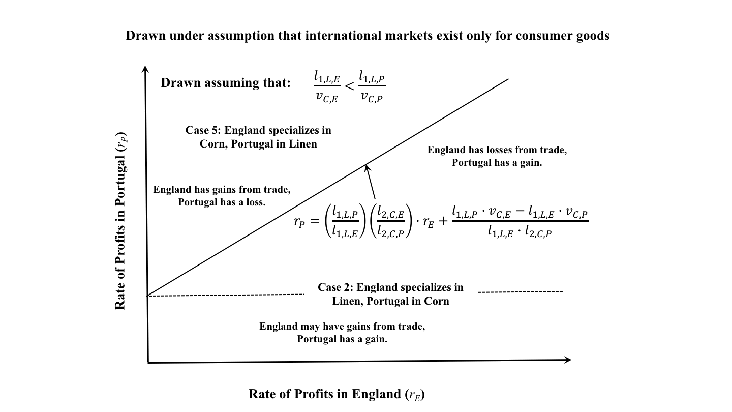 A specific region in the space for the national rates of profits corresponds to each pattern of specialization. Figure 1, above, shows these two regions, as divided by the upward-sloping line. The figure is drawn under the assumption that England has a comparative advantage in producing linen.