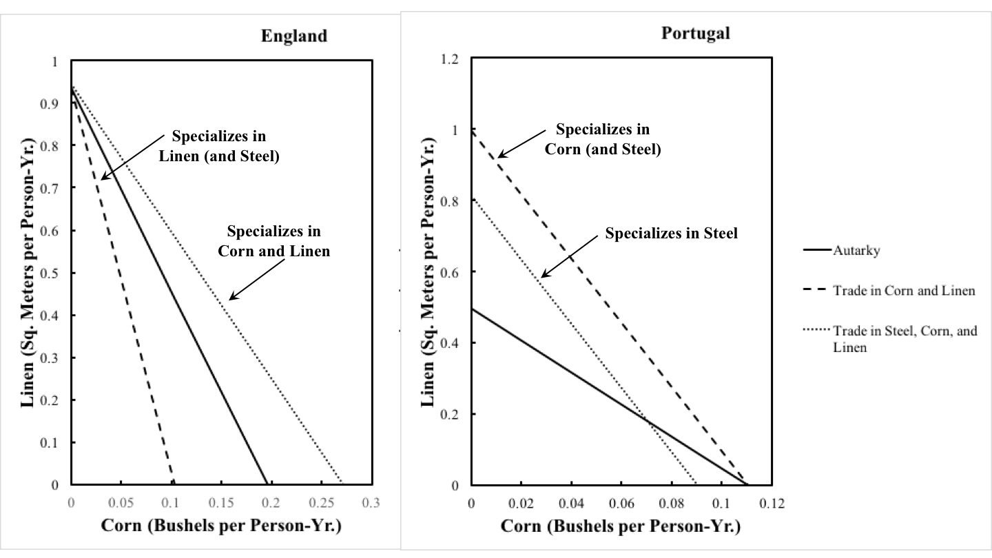 The opening up of foreign markets in steel has made England better off, both in comparison to autarky and in comparison with foreign trade only being possible in consumer goods. (Although it is difficult to see in Figure 1, the intercept of the PPF, for trade in all commodities, with the ordinate strictly exceeds the intercept for the other PPFs). The opening up of foreign trade in steel has made Portugal worse off, as compared to trade only in consumer goods. Whether the Portuguese are better off as compared to autarky is ambiguous. It depends on the consumption basket.