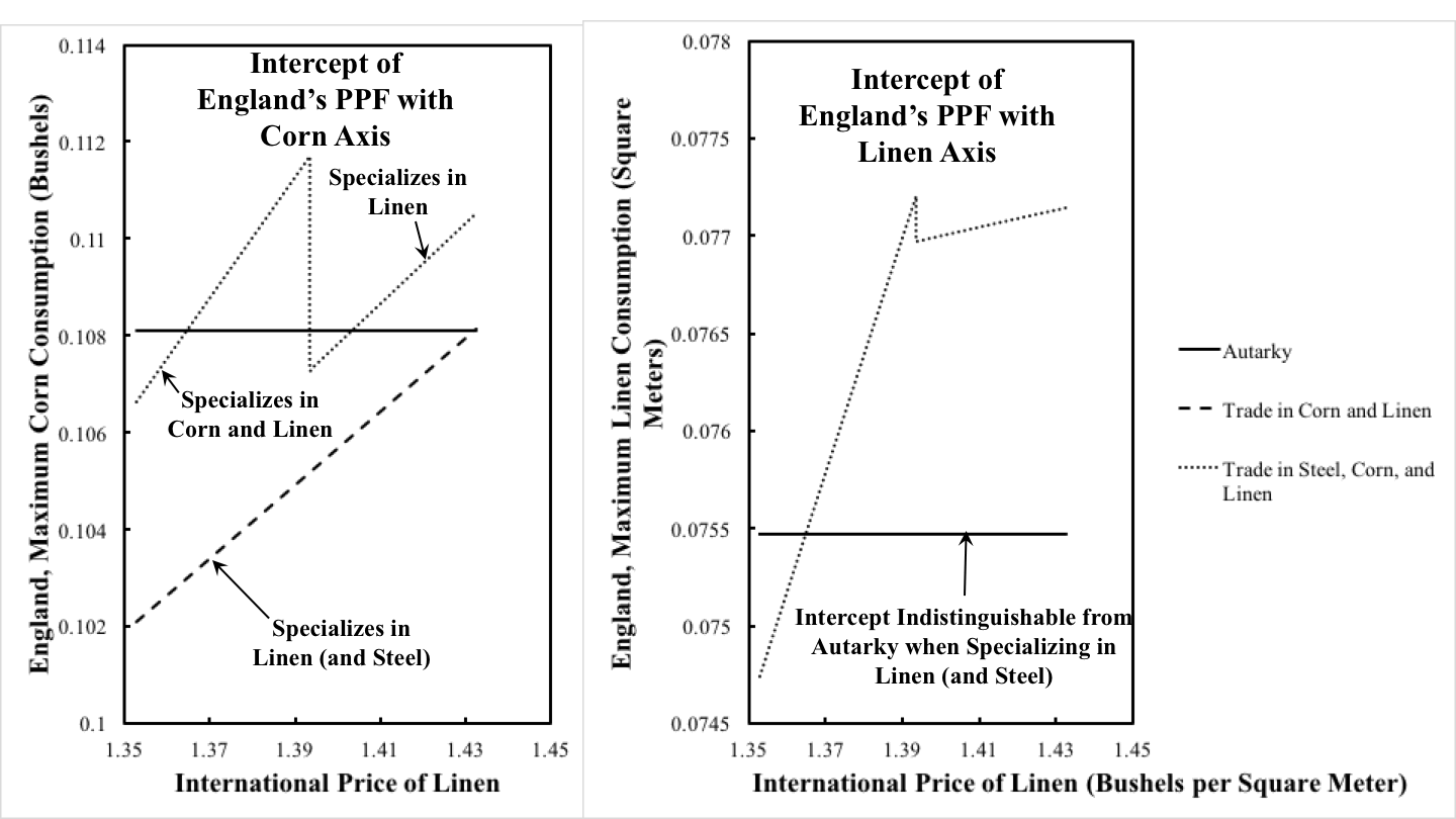 - For a low price of linen in this range and a consumer basket heavily weighted to corn, England suffers a loss from trade, as compared to autarky.